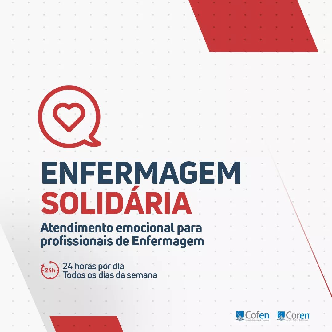 A partir desta quinta-feira (26/03), às 7h, o Conselho Federal de Enfermagem (Cofen) disponibilizará um canal de atendimento 24h, todos os dias da semana, para que os profissionais de Enfermagem possam procurar ajuda emocional em meio à situação de pandemia do Coronavírus (COVID-19) pela qual o Brasil e o mundo passa atualmente.
