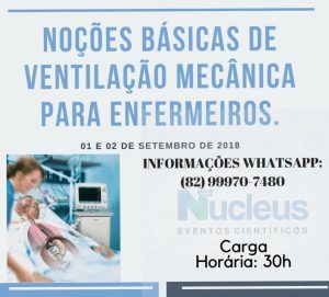 O Conselho Regional de Enfermagem de Alagoas (Coren-AL) apóia o curso de Noções de Ventilação Mecânica, que vai acontecer nos dias 01 e 02 de setembro, no Conselho Regional de Psicologia, no Pinheiro. O objetivo é demonstrar aos seus participantes o conhecimento técnico e cientifico sobre como manusear aparelhos de ventilação mecânica invasiva e não invasiva.