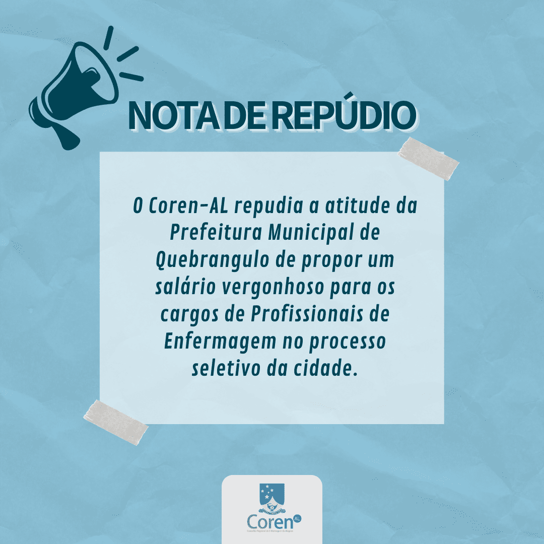 O Conselho Regional de Enfermagem de Alagoas (Coren-AL) vem a público, por meio de nota, repudiar a atitude da Prefeitura Municipal de Quebrangulo que lançou edital para processo seletivo, para cargos de Enfermeiro plantonista, Enfermeiro, Técnico de Enfermagem hospital e Técnico de Enfermagem PSF, e oferecem um salário inferior, ou igual, a outras categorias de nível superior que têm uma carga horária menor.