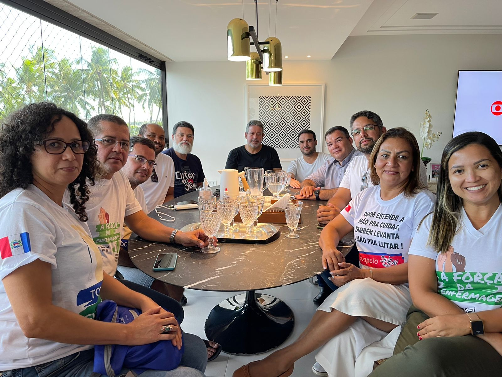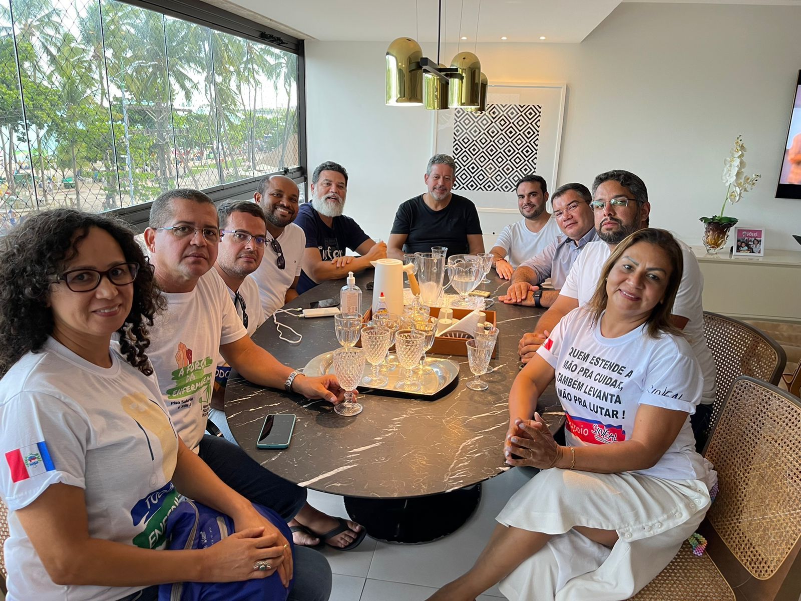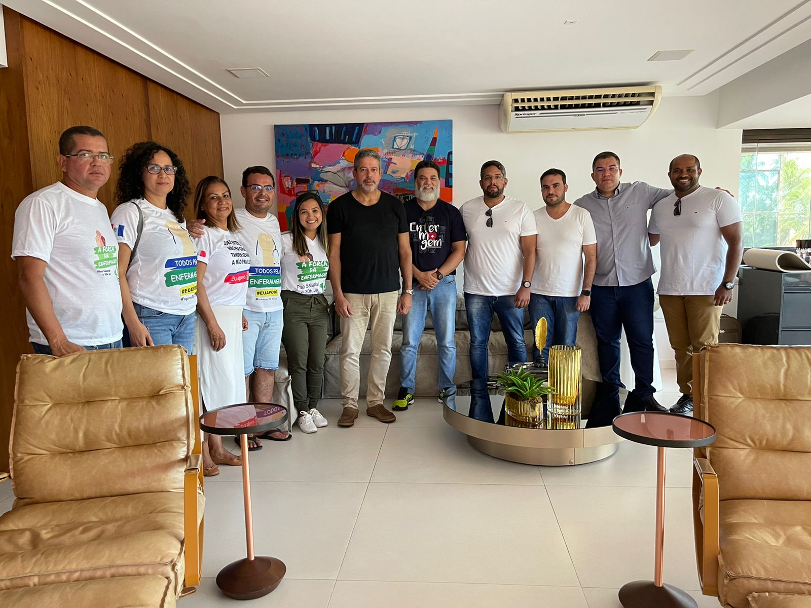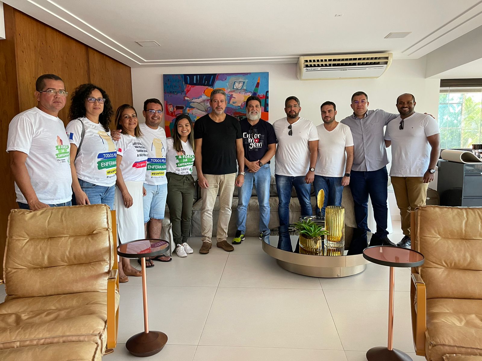 Após a manifestação, Arthur Lira recebeu na sua própria casa, em Maceió, representantes do Coren Alagoas e do Sineal, além dos deputados Jorge Vianna (Podemos-DF) e Davi Maia. O presidente da Câmara dos Deputados garantiu que nesta terça-feira (22) será votada a urgência do PL do Piso Salarial da Enfermagem.