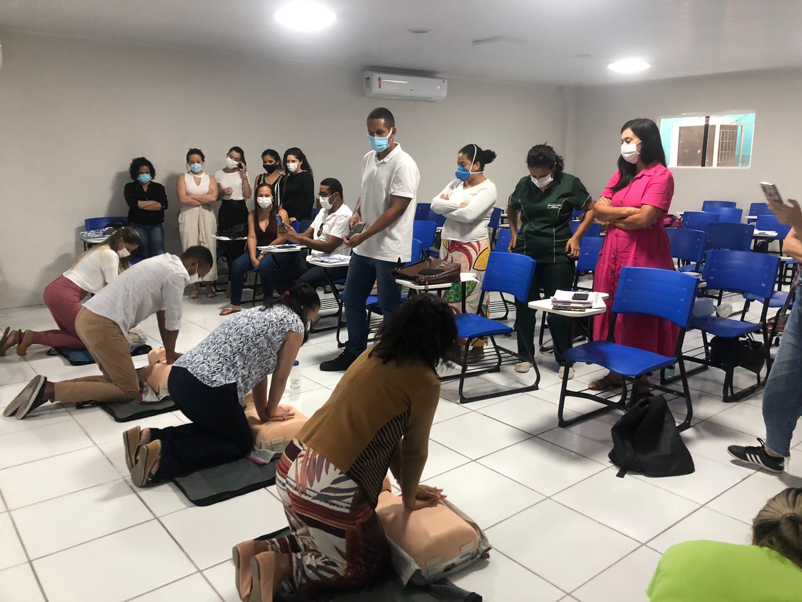 “A gente realizou, pela manhã, o treinamento de Suporte Avançado de Vida, na parada cardiorrespiratória. A turma contou com 30 alunos, entre enfermeiros e técnicos em enfermagem, onde abordamos os principais tópicos para o atendimento de uma parada cardiorrespiratória, como reconhecer a parada, os ritmos que existem, realizar compressão de alta qualidade, ventilações adequadas, uso de desfibrilador manual, as medicações necessárias”, conta Guimarães.