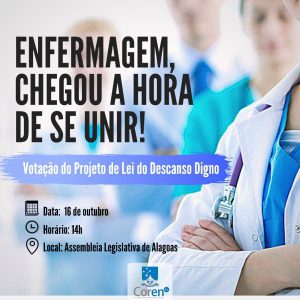 O Projeto de Lei sobre o descanso digno da enfermagem, de autoria do Deputado Estadual Davi Maia, deve ser votado no próximo dia 16 de outubro na Assembleia Legislativa do Estado de Alagoas (ALE). O presidente do Conselho Regional de Enfermagem de Alagoas (Coren-AL), Renne Costa, convoca todos os profissionais para uma grande mobilização no dia da votação.