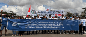 Contrariando previsões da chuva, o tempo abriu para a Marcha pela Valorização da Enfermagem atravessar a Esplanada dos Ministérios até o Congresso Nacional. Representando 3 milhões de profissionais, 5 mil participantes de todo Brasil pedem o reajuste do Piso Salarial e a aprovação da Proposta de Emenda à Constituição (PEC) 19. A PEC 19 prevê correção inflacionária e sua vinculação do piso à jornada de 30h.