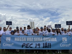“Eu quero ouvir, do início ao fim da marcha: coragem! Nós, presidentes de Coren, estamos com vocês nesta luta. Vamos manter a mobilização até aprovar a PEC 19”, conclamou a presidente do Coren-RJ, Lilian Behring, deputada estadual (PCdoB). No chão da Esplanada, subiam palavras de ordem e cobranças ao senador Otto Alencar (PSD – BA), presidente de CCJ, para pautar a PEC 19.