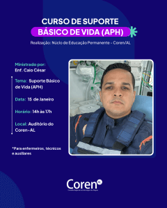O Curso de Suporte Básico de Vida (APH) acontecerá no dia 15 de janeiro no auditório da sede do Coren-AL, em Maceió.
