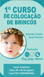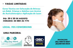 Através da técnica de auriculoterapia e aplicação de laser, a empresa Baby Query Assessoria, da enfermeira Cristina Cardoso, realiza o 1º curso de colocação de brincos em bebês e adultos para enfermagem, nos dias 29 e 30 de agosto, das 8h às 17h, no FDS Coworking, em Arapiraca.