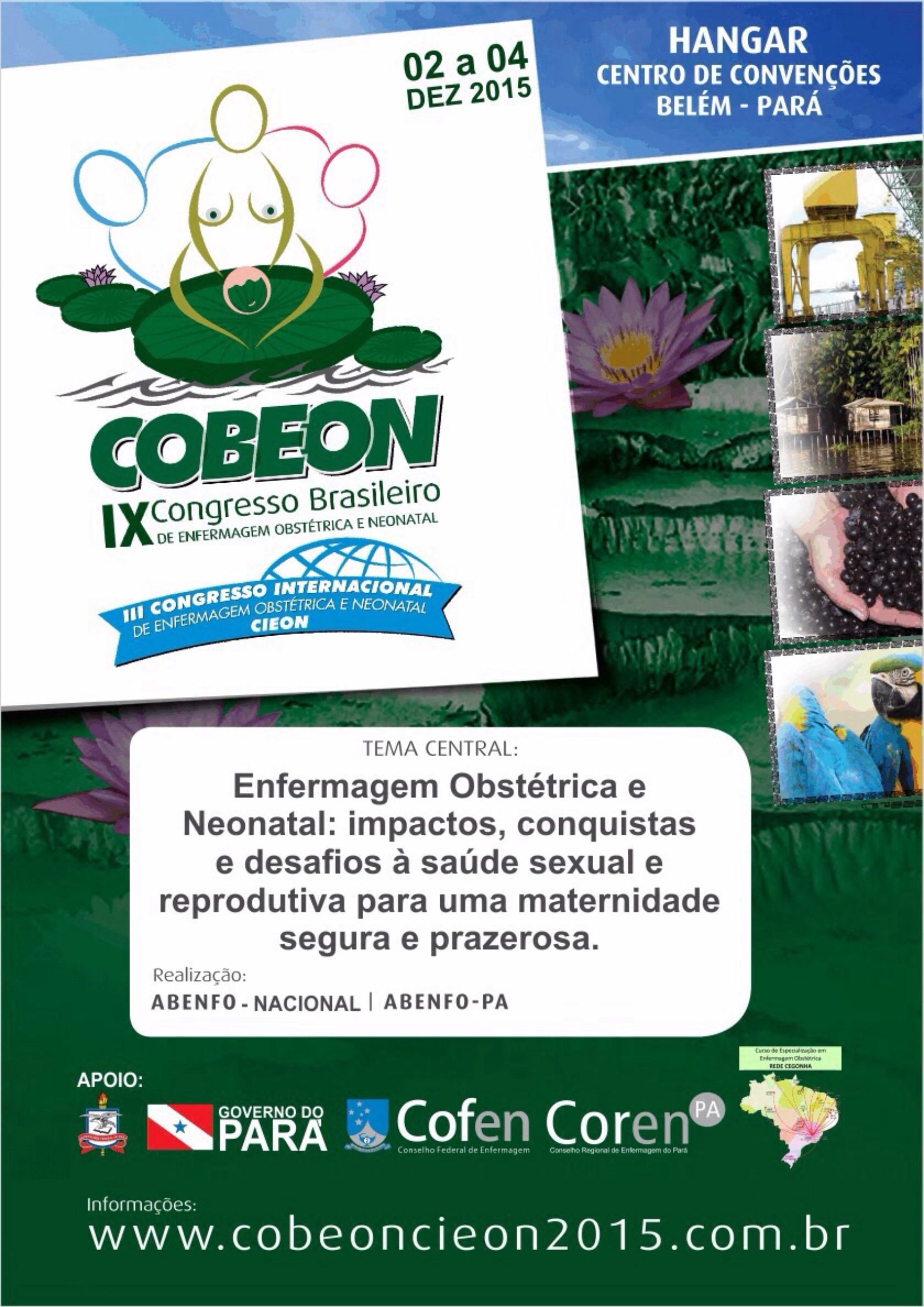 A Associação Brasileira de Enfermeiros Obstetras -ABENFO – NA em parceira com a ABENFO – PÁ, convida a todos os profissionais para participar do IX COBEON / III CIEON, que acontecerá no período de 02 a 04 de Dezembro de 2015, no Hangar Centro De Convenções da Amazônia, em Belém do Pará.
