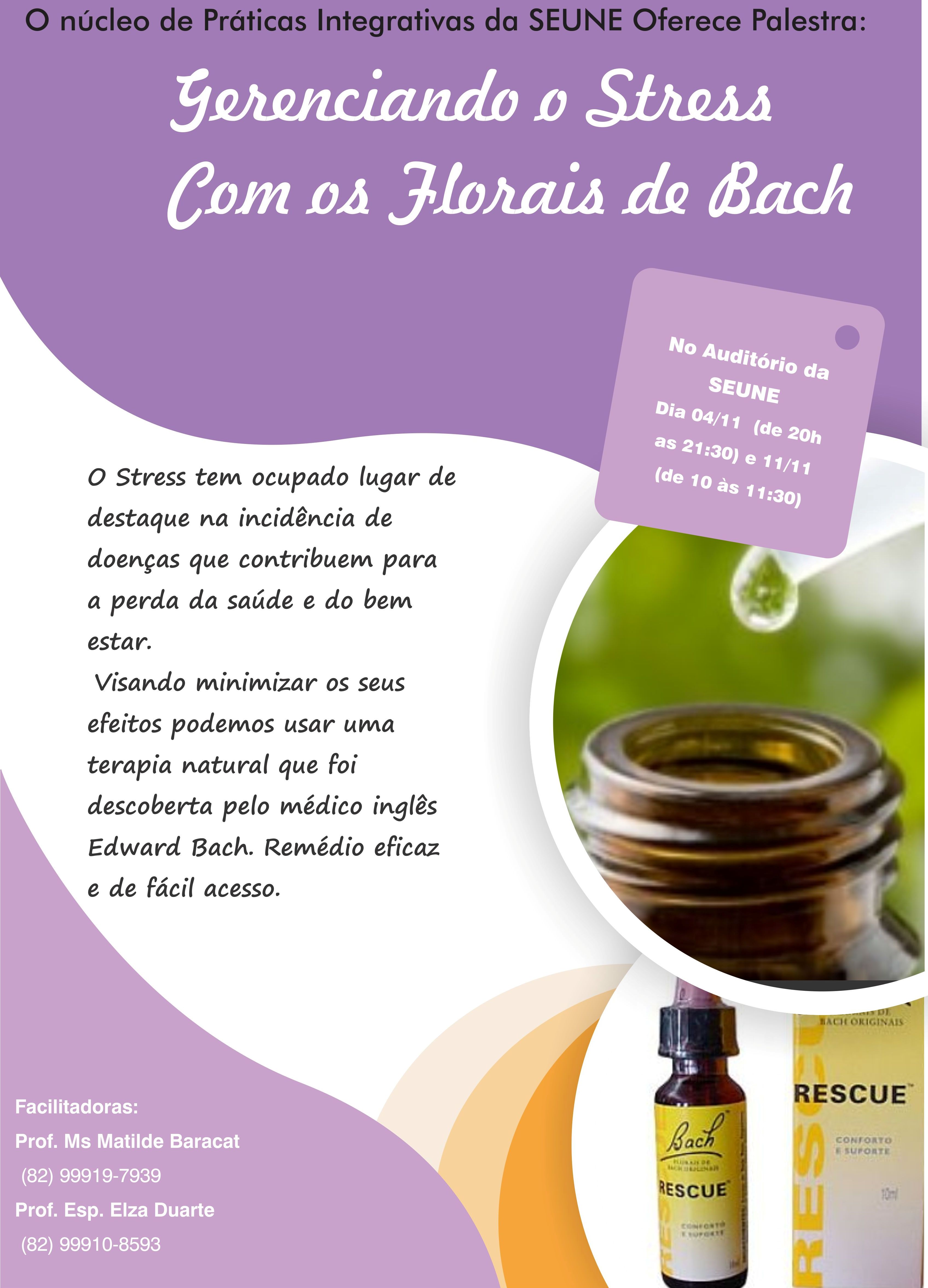 O Núcleo de Práticas Integrativas do curso de Enfermagem da Faculdade SEUNE vai oferecer, nos dias 4 e 11 de Novembro, a palestra “Gerenciando o Stress com os Florais de Bach”.