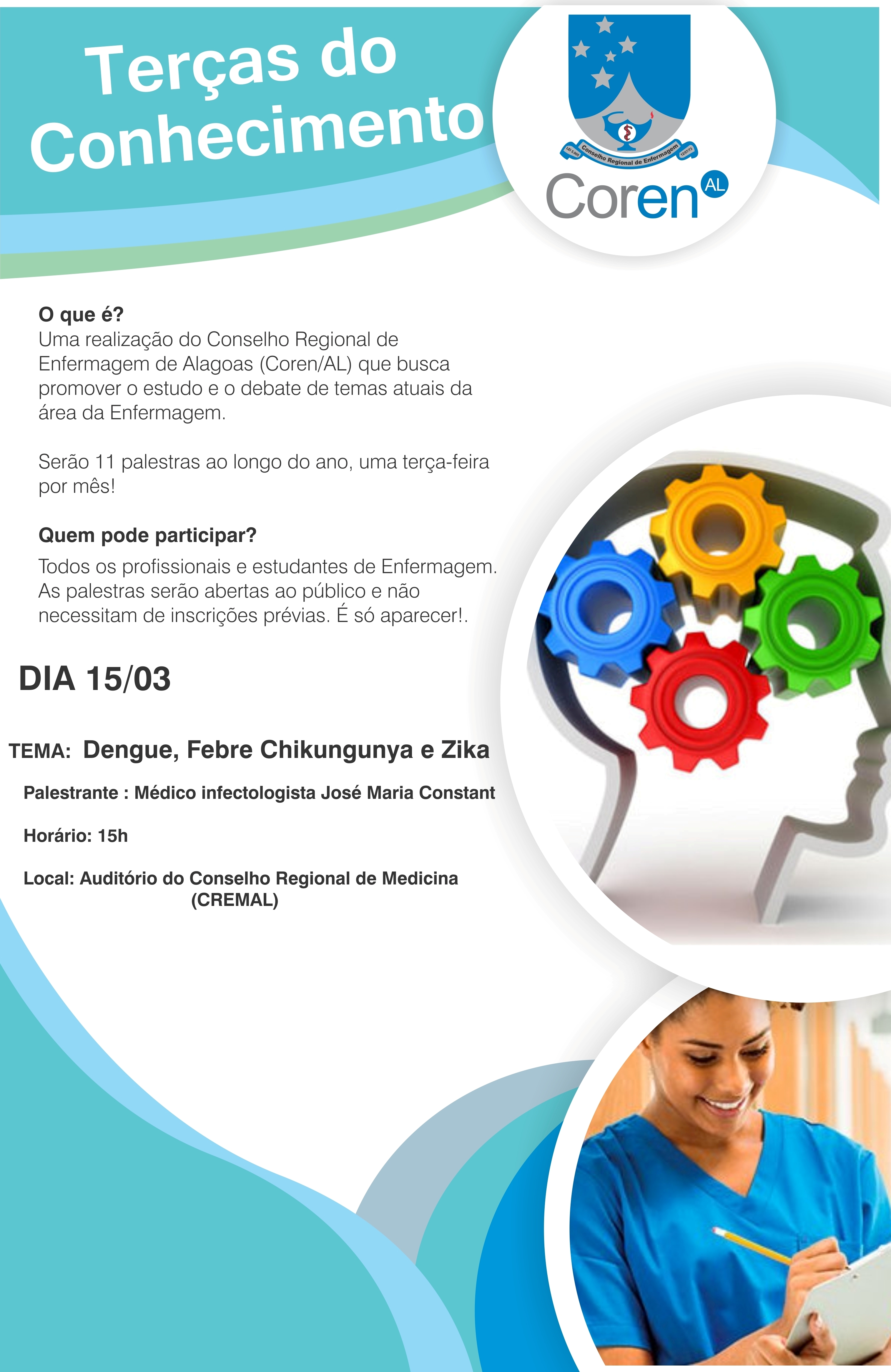 Essa palestra está dentro da programação do ciclo de palestras que o Conselho Regional de Enfermagem de Alagoas iniciou em Fevereiro intitulado de “Terças do Conhecimento”. Serão onze palestras, uma terça-feira por mês, destinadas ao estudo e ao debate de temas atuais na área da Enfermagem. As palestras são abertas ao público e não é necessário fazer inscrição prévia.