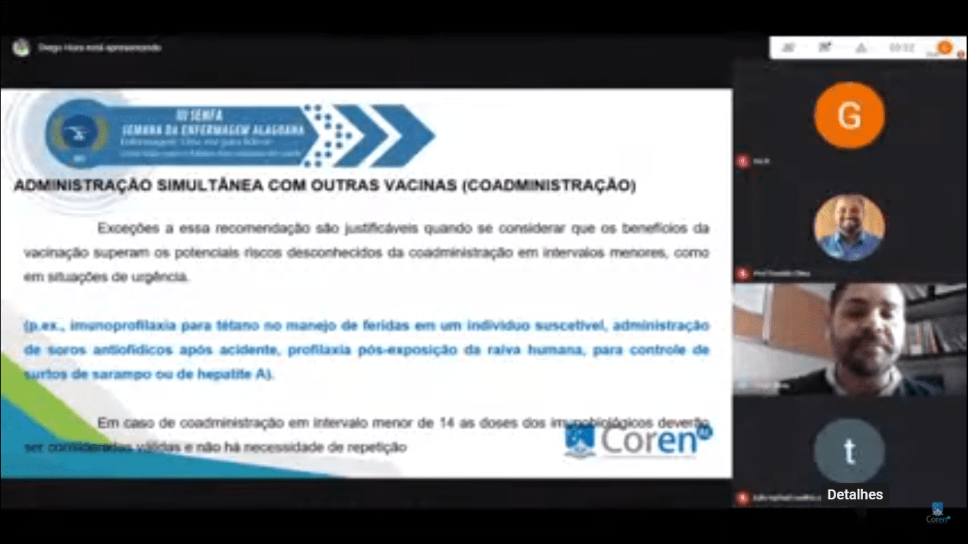 No dia dedicado aos profissionais técnicos e auxiliares de enfermagem e último dia da III SENFA, 20 de maio, o Enfermeiro Diego Pereira Gonçalo da Hora, que é epidemiologista e gerente de Vigilância e Controle de Doenças Transmissíveis da Secretaria Estadual de Saúde de Alagoas (Sesau), discutiu sobre as vacinas no combate a Covid-19. Explicando a importância do profissional da enfermagem na aplicação dessa vacina, como também o conhecimento do mesmo no assunto da vacina que irá aplicar.